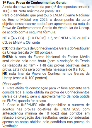 Como é calculada a nota da primeira fase da Unesp 2025. Veja fórmula, aproveitamento do ENEM, segunda fase, critérios de desempate e preenchimento de vagas.