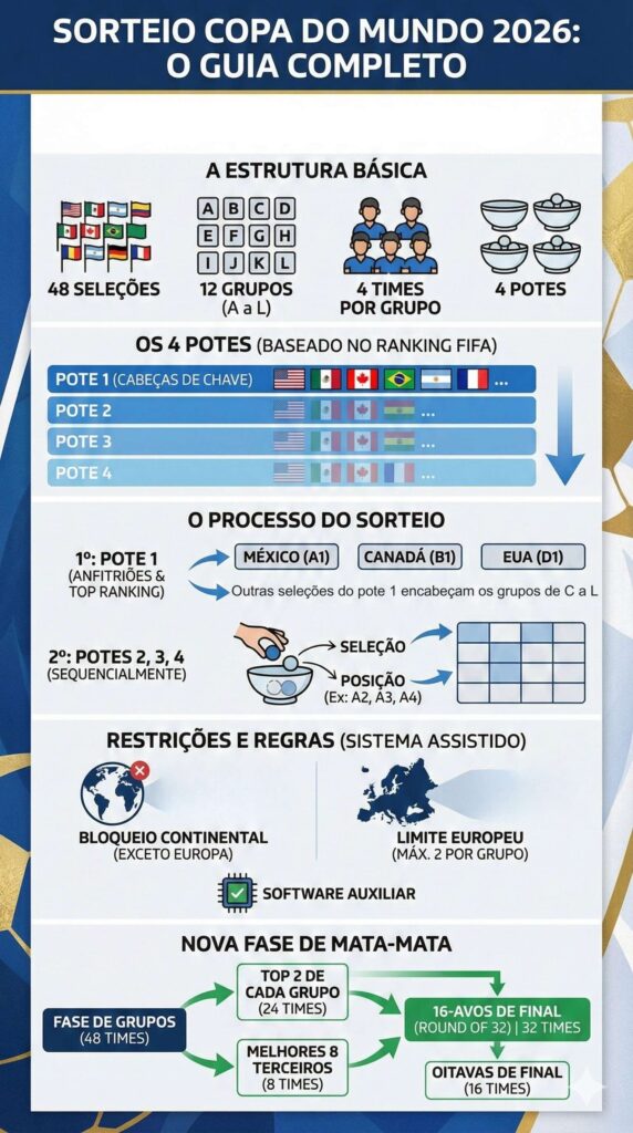 São 12 grupos (de A a L) e 48 times, distribuídos em quatro potes. O sorteio definirá os confrontos iniciais, em uma escala inédita de logística e organização, adotada pela Federação Internacional de Futebol (Fifa) pela primeira vez na história.