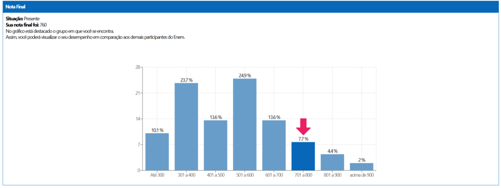 Lembrando que cada uma das competências vale 200 pontos. E no final, você ainda consegue conferir em um gráfico como foi o seu desempenho em relação aos outros candidatos.