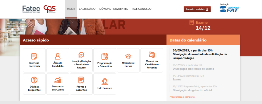 A consulta ao local de prova do Vestibular Fatec 2026 começa em 09 de dezembro de 2025, na Área do Candidato do site oficial do vestibular.