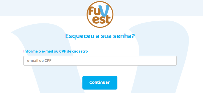 Se você esqueceu sua senha de acesso, pode clicar em “Esqueci minha senha”. Daí, é só preencher o seu e-mail ou o número do seu CPF e clicar em “Continuar”, para conseguir resgatar o seu acesso à área do candidato.