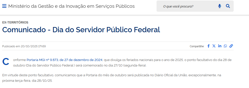 O comunicado oficial informa que, em razão do ponto facultativo, a Portaria do mês de outubro será publicada no Diário Oficial da União de forma excepcional, na terça-feira, 28 de outubro de 2025.