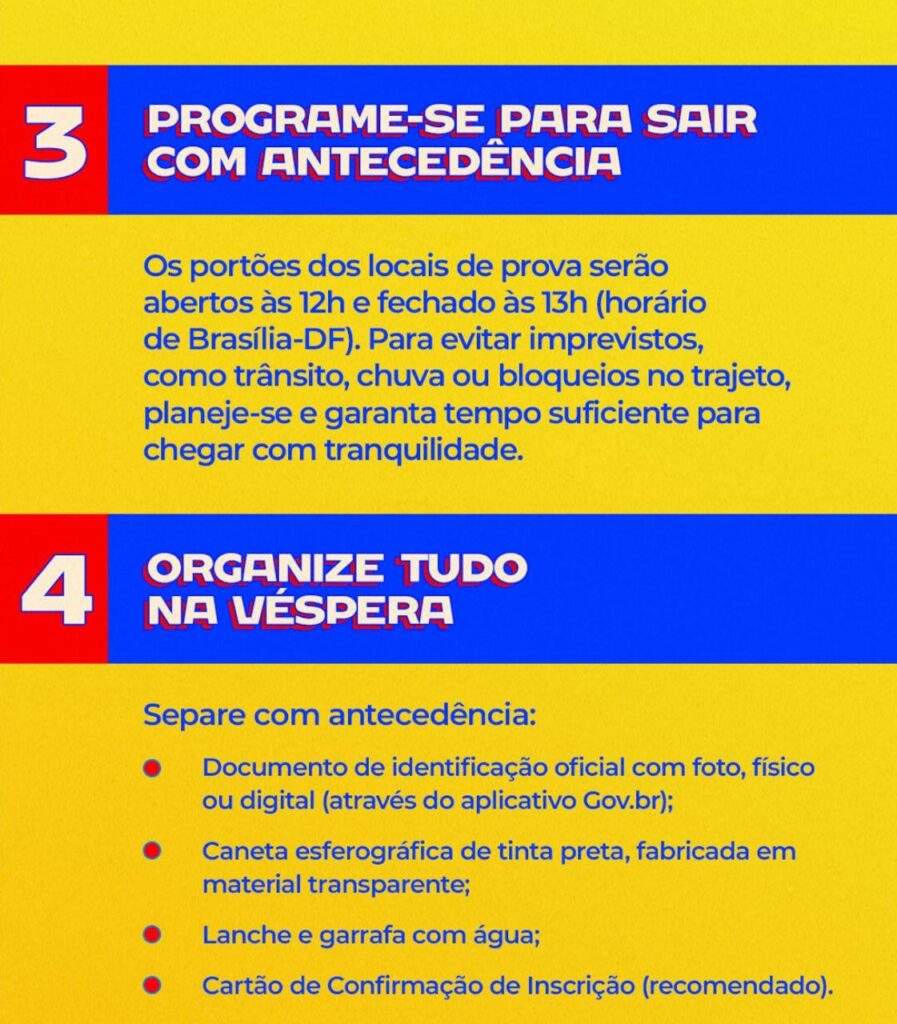 Para evitar atrasos e garantir a entrada antes do fechamento dos portões, o MEC e o Inep divulgaram orientações específicas para ajudar quem deve comparecer ao local dentro do horário.