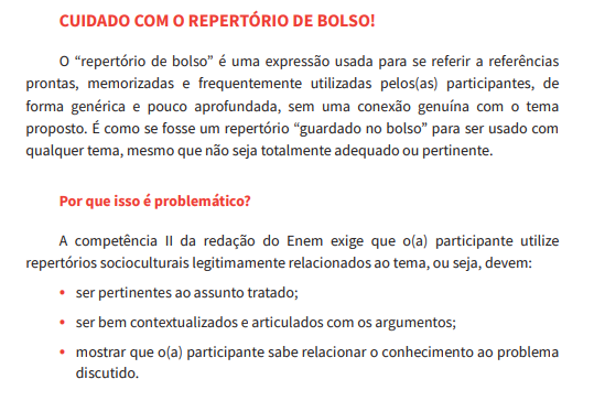 O documento chama atenção para o uso dos chamados “repertórios de bolso”, expressões e referências decoradas, aplicadas de forma genérica e sem relação direta com o tema proposto.