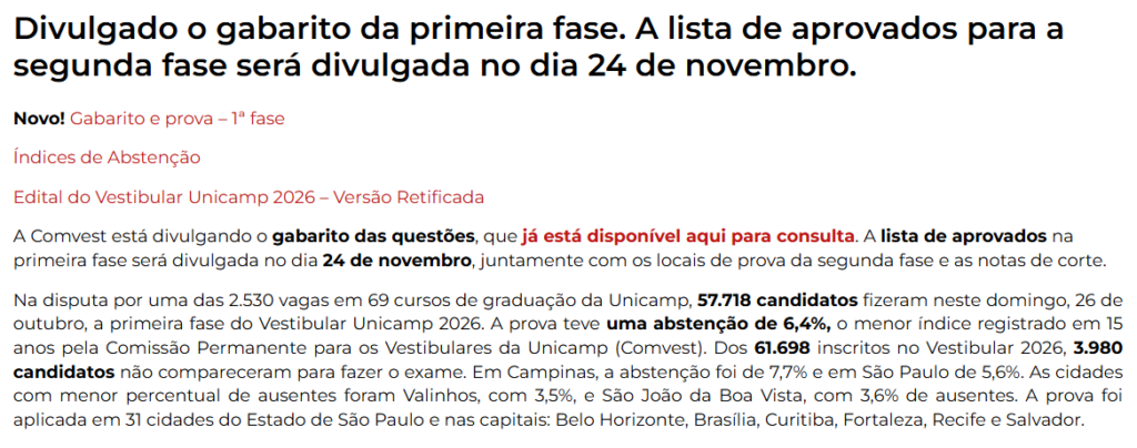 Os candidatos podem consultar as respostas acessando a área do candidato no site da Comvest, na seção “Gabarito e Prova”. A lista de aprovados será divulgada em 24 de novembro de 2025.