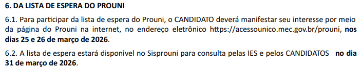 Trecho do edital do Prouni 2026.1 sobre a lista de espera do programa