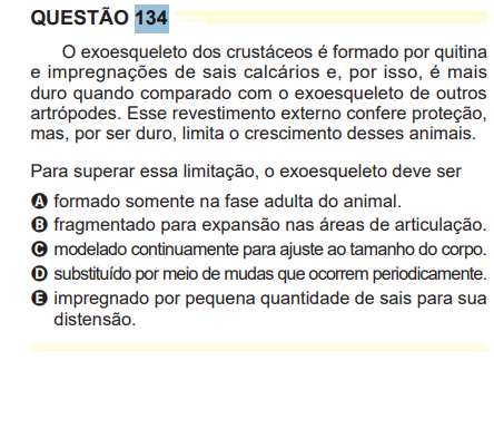 O exoesqueleto de artrópodes limita o crescimento dos animais desse grupo. Nesse sentido, o animal só cresce quando há a muda, fenômeno que ocorre periodicamente.