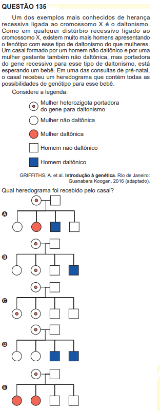 O homem não daltônico tem genótipo XDY, a mulher portadora tem genótipo XDXd. Desse modo, o casal poderá ter meninas não daltônicas e não portadoras (XDXD), meninas não daltônicas e portadoras (XDXd), meninos não daltônicos (XDY) e meninos daltônicos (XdY).