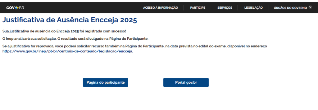 Em resumo, para você conseguir fazer a justificativa de ausência do Encceja 2026, você deve entrar na página do participante Encceja e clicar em “justificativa de ausência.