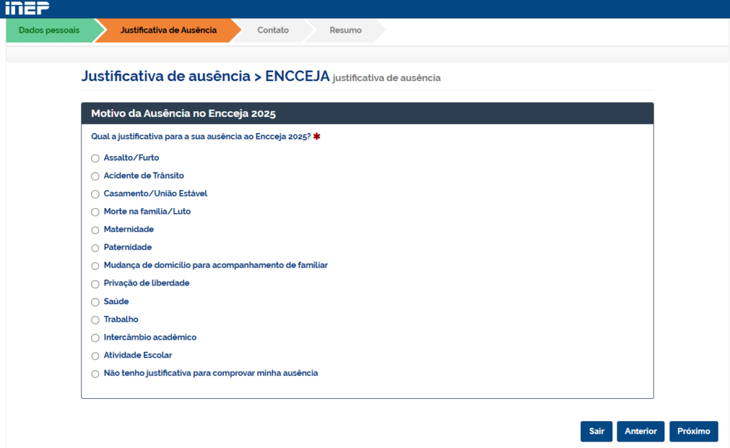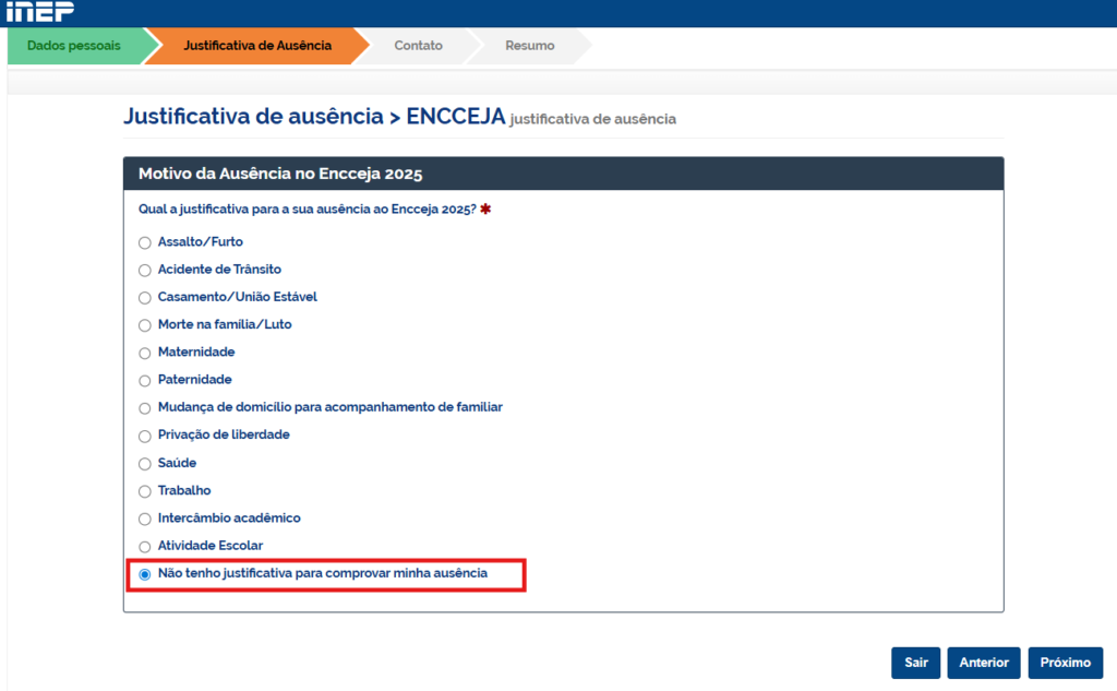 Se você não se enquadrar nas alternativas disponíveis, clique em “Não tenho justificativa para comprovar minha ausência”