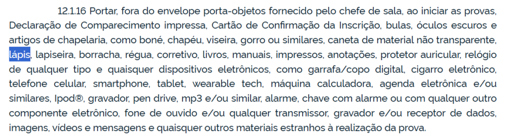 Entre os itens mais citados, o que aparece com frequência é o lápis, material comum em outros exames e proibido em alguns deles.