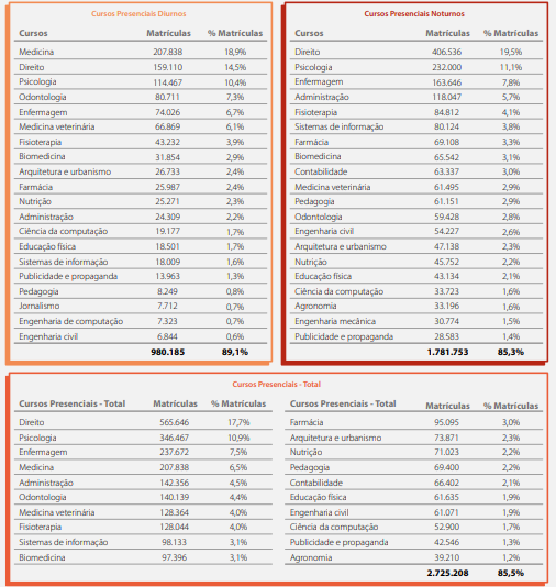 Esses cursos somam 89,1% das matrículas presenciais analisadas.