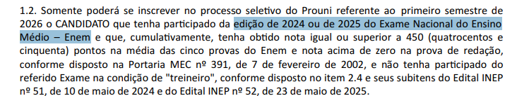 Logo no início do edital, é possível ter acesso a essa informação de qual nota do Enem que pode ser usada no Prouni 2026.1.