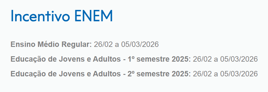 De acordo com o calendário, disponibilizado pela Caixa, os pagamentos do programa para quem participou do Enem 2025 estão previstos para acontecer entre os dias 26 de fevereiro a 5 de março de 2026.