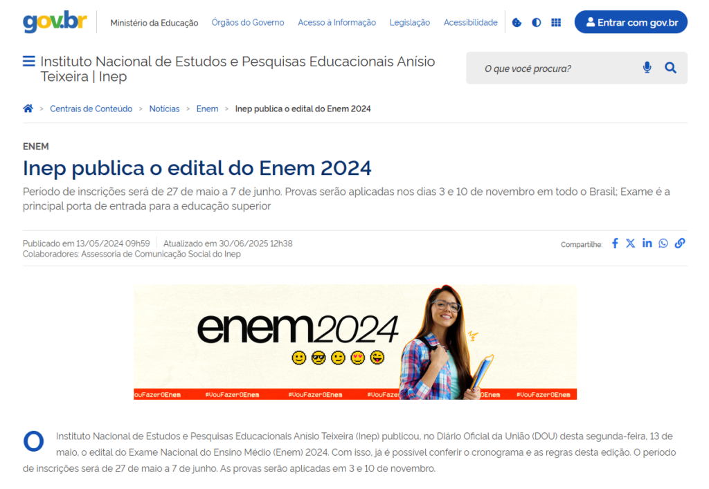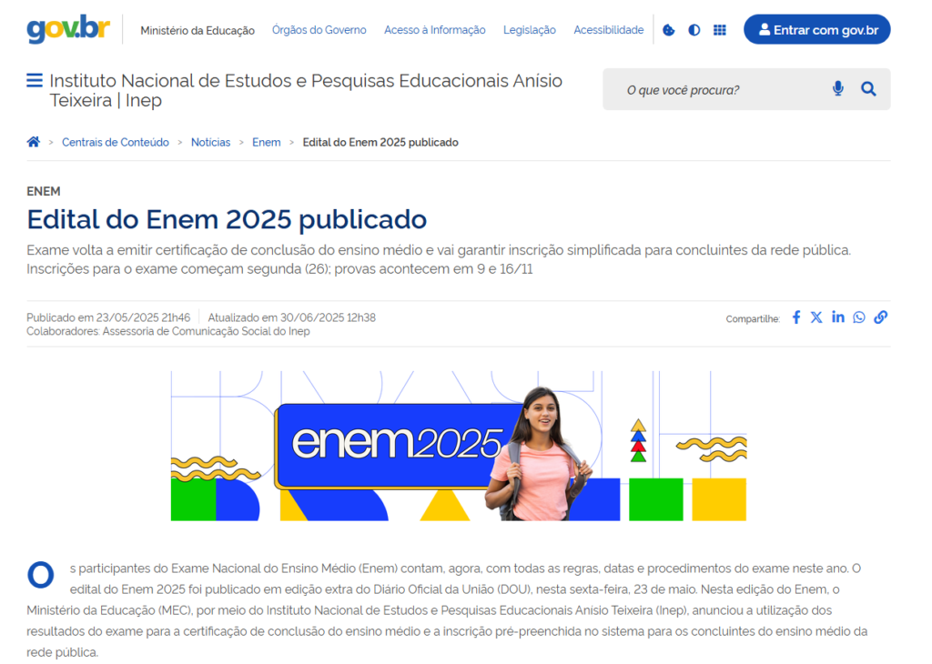 Em 2025, por exemplo, o edital do Enem foi divulgado no dia 23 de maio, dois dias antes do período de inscrições (que aconteceu de 26 de maio a 6 de junho).