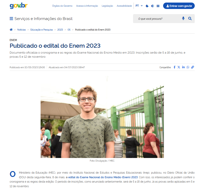 Em 2023, o edital do Enem foi publicado no dia 8 de maio, com as inscrições sendo de 5 a 16 de junho.
