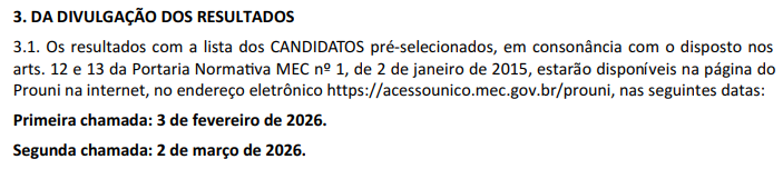 Trecho do edital do Prouni 2026, com a informação sobre as datas de divulgação dos resultados