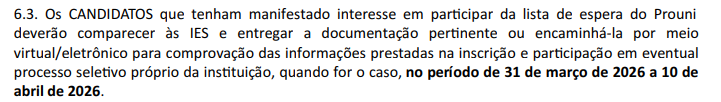 Trecho do edital do Prouni 2026, com a informação sobre a data de divulgação da lista de espera
