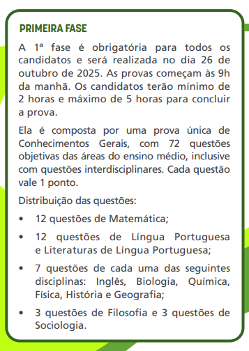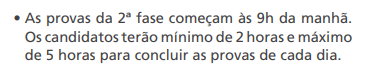 O tempo mínimo que o candidato deve ficar em sala é de 2 horas, e a prova acontece no período da manhã (diferente da maioria dos vestibulares).