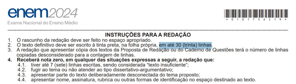 Um ponto relevante para se ter em mente aqui é que existe um também um número mínimo de linhas que deve ser respeitado, afinal, redações com até 7 linhas são consideradas insuficientes e recebem nota zero, ok?