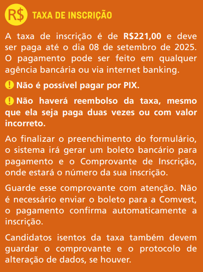 As inscrições poderão ser feitas no período de 3 a 31 de agosto de 2026, pela internet, na página da Comvest.