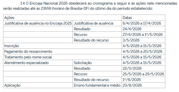 + Calendário do Encceja 2026 é divulgado; veja todas as datas da prova!
