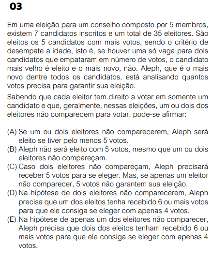 “Logo, não podemos garantir que Aleph se eleja com 5 votos, como sugere o primeiro trecho do item C”, explicam os professores do Colégio Oficina do Estudante em sua correção.
