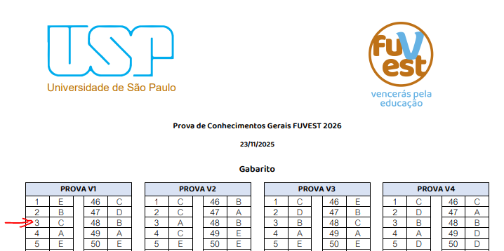 + Gabarito Fuvest 2026 1ª fase: prova V3