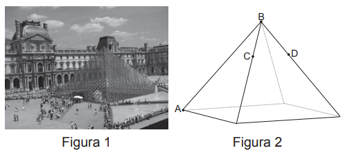 O Museu do Louvre, localizado em Paris, na França, é um dos museus mais visitados do mundo. Uma de suas atrações é a Pirâmide de Vidro, construída no final da década de 1980. A seguir tem-se, na Figura 1, uma foto da Pirâmide de Vidro do Louvre e, na Figura 2, uma pirâmide reta de base quadrada que a ilustra.