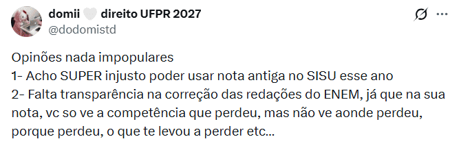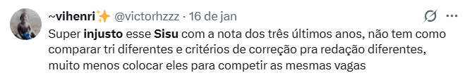 A mudança gerou críticas entre estudantes concluintes do ensino médio nas redes sociais. Muitos relatam que se sentem em desvantagem, já que outros participantes podem ter mais de uma edição válida para concorrer, ampliando as chances de alcançar uma vaga, confira: