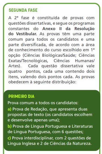 Na segunda fase, as provas são realizadas em dois dias seguidos (nos dias 30 de novembro e 1º de dezembro de 2025) e incluem questões dissertativas. A primeira parte será comum para todos os candidatos e incluirá: