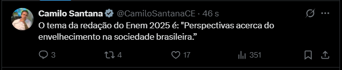 O tema da redação do Enem 2025 é “Perspectivas acerca do envelhecimento na sociedade brasileira”, anunciado no primeiro dia de provas, em 9 de novembro.