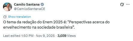 O tema de redação proposto para este ano foi “Perspectivas acerca do envelhecimento na sociedade brasileira”. A divulgação foi feita pelo ministro da Educação, Camilo Santana.