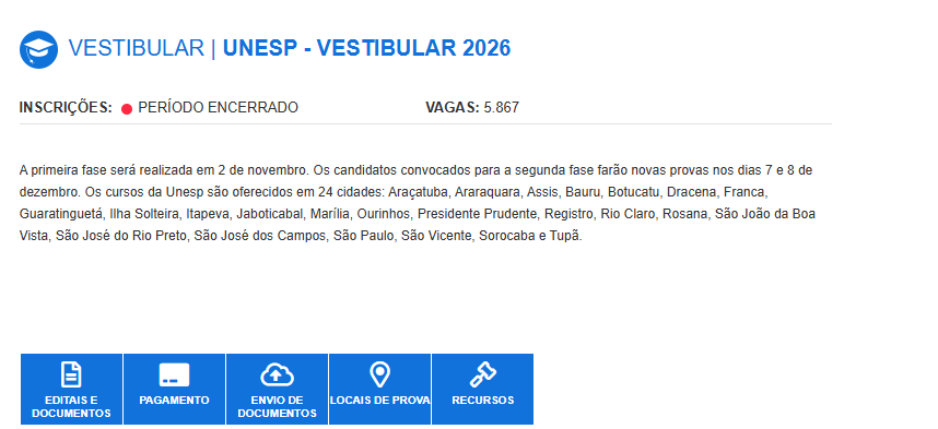 A Universidade Estadual Paulista (Unesp) divulgou o local de prova do Vestibular 2026, que será aplicado em 2 de novembro de 2025, data da primeira fase.