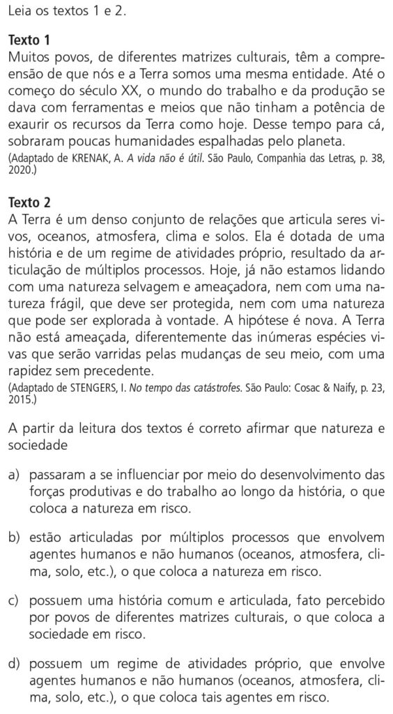 “A prova de sociologia também seguiu essa linha: bastante texto e comparações entre eles, uma primeira questão partindo de uma situação mais cotidiana e aproximando-a de um critério sociológico de análise; uma segunda questão envolvendo aspectos da antropologia, trazendo Ailton Krenak, e uma terceira questão que também tratou das questões de gênero, associando-as à adolescência”, relata.